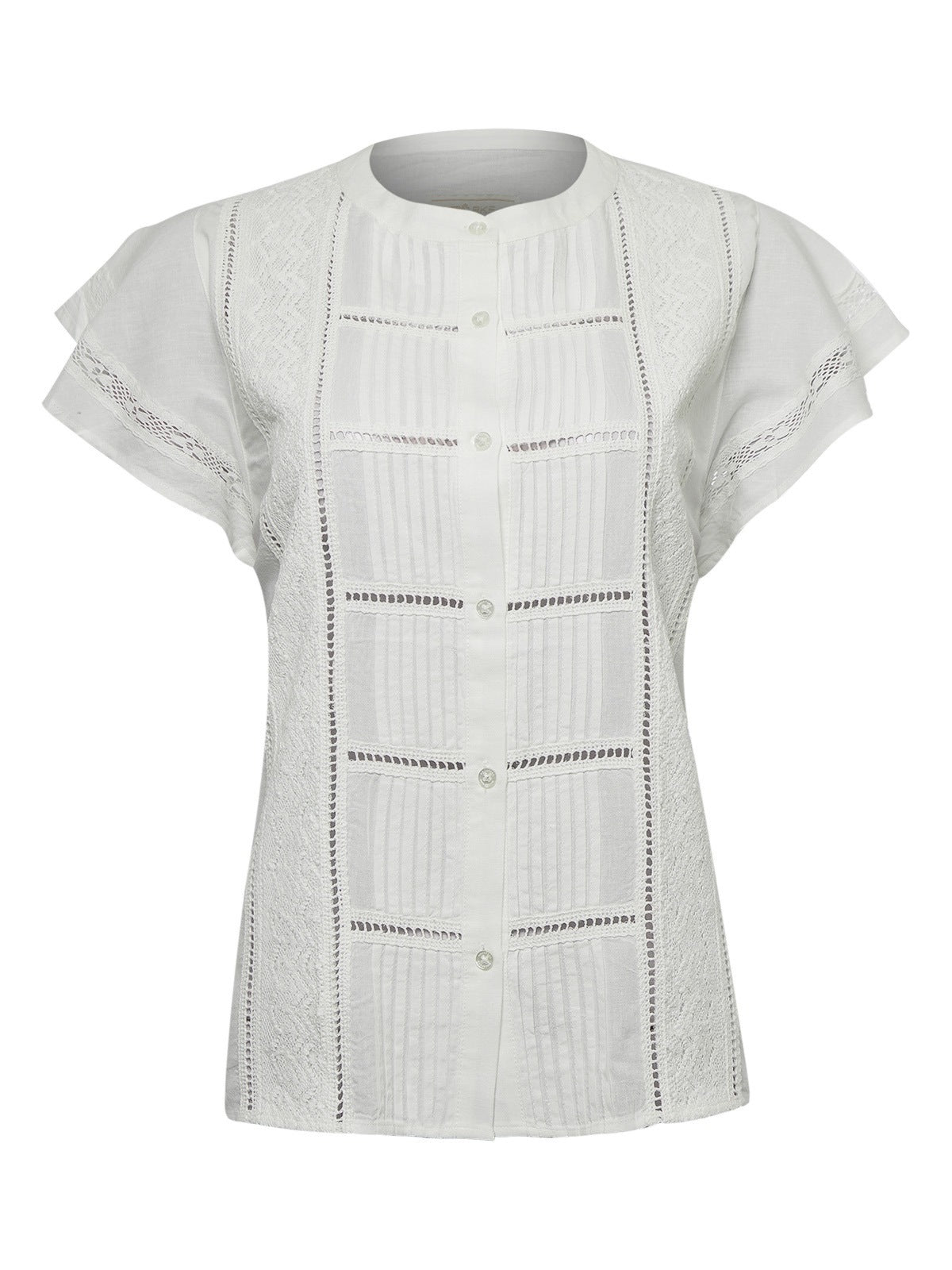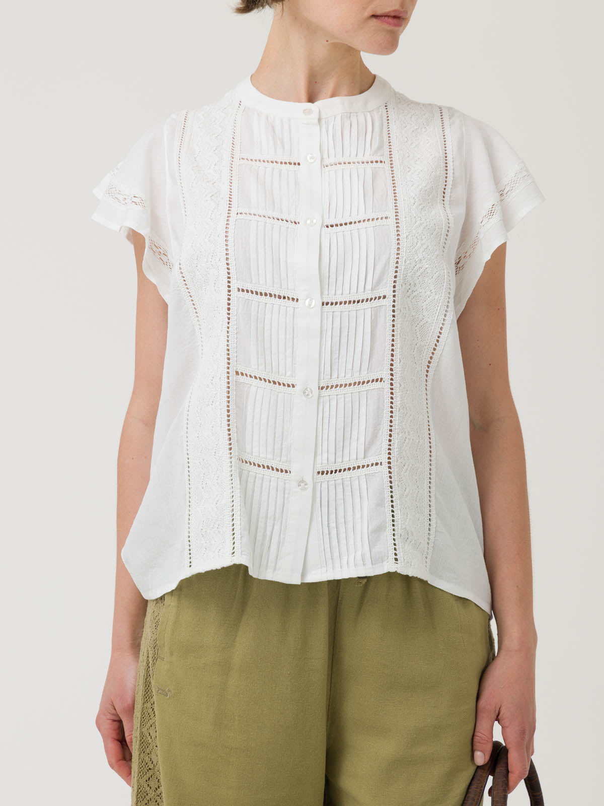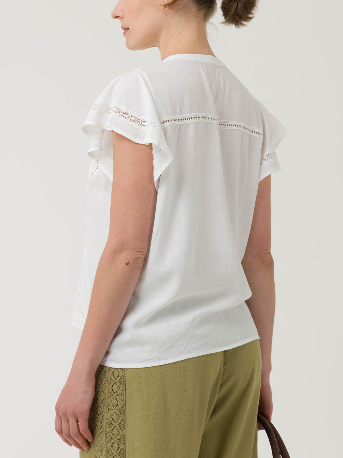 Este modelo presenta cuello redondo, frente con botones y mangas cortas con un sutil volado que suma movimiento y feminidad. El frente se realza con broderie y técnica de calado, aportando detalle artesanal y un toque distintivo. Gracias al uso de fibras naturales y sostenibles, la Camisa Sulta es una prenda que no solo se luce por su estilo, sino también por su compromiso con el cuidado del planeta.