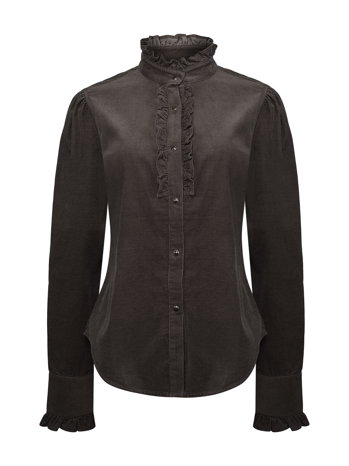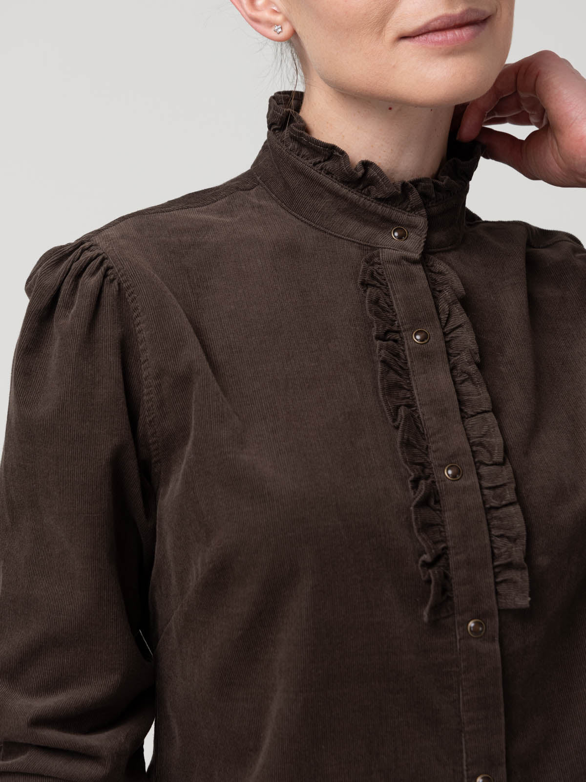 La Blusa Borage está confeccionada en cotelé de algodón orgánico con botones snap, un tejido suave y cálido que aporta una textura distintiva y natural. Su diseño incorpora un cuello fruncido y delicados volantes en el frente, creando una estética femenina y atemporal.