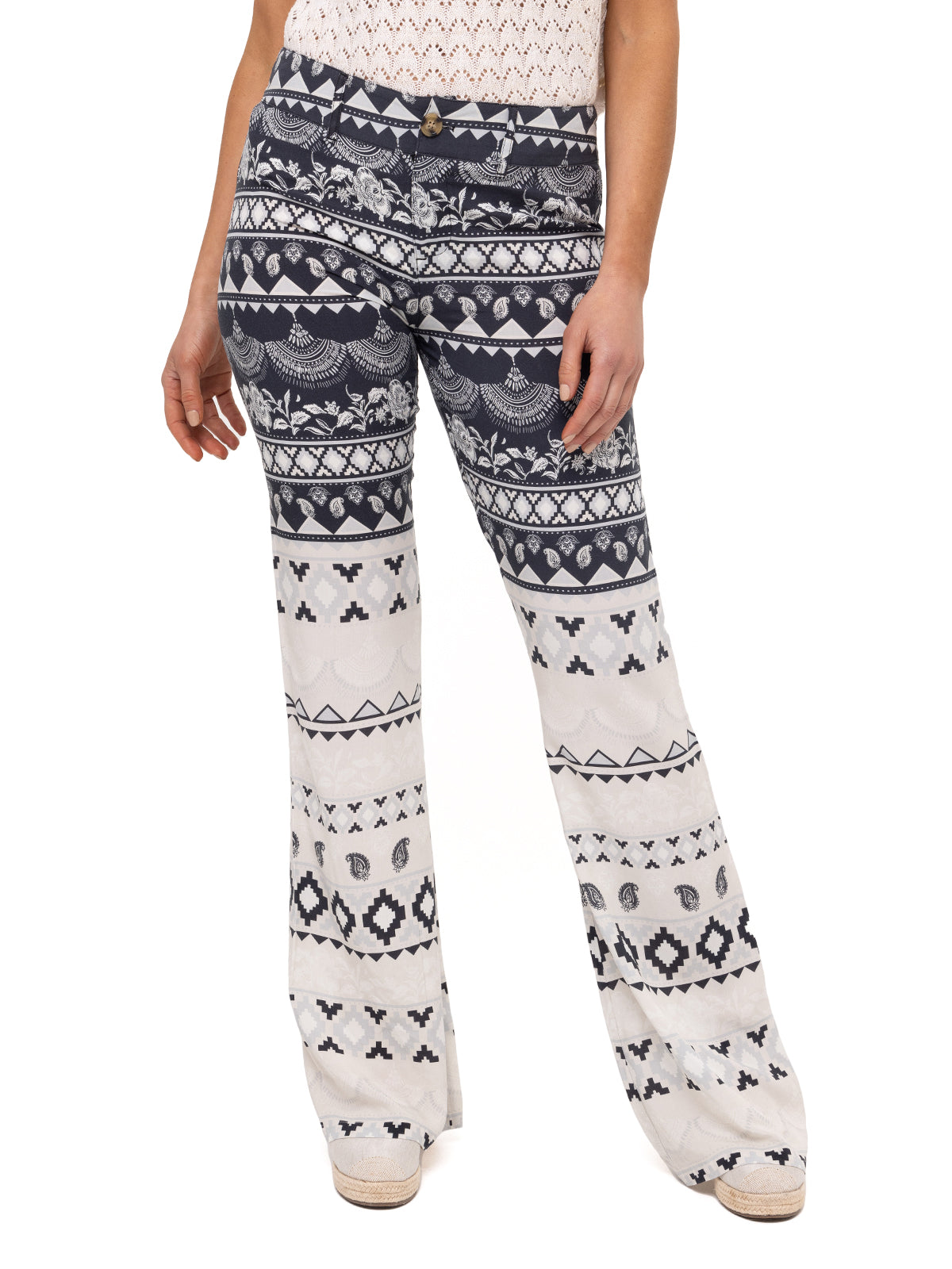 Pantalón de pierna ancha es ideal para sentirte cómoda y fresca en tus aventuras al aire libre. Confeccionado con una tela liviana y suave, su diseño étnico en degrade con colores vibrantes evoca la energía y vitalidad del verano, conectándonos con la naturaleza en su máximo esplendor.