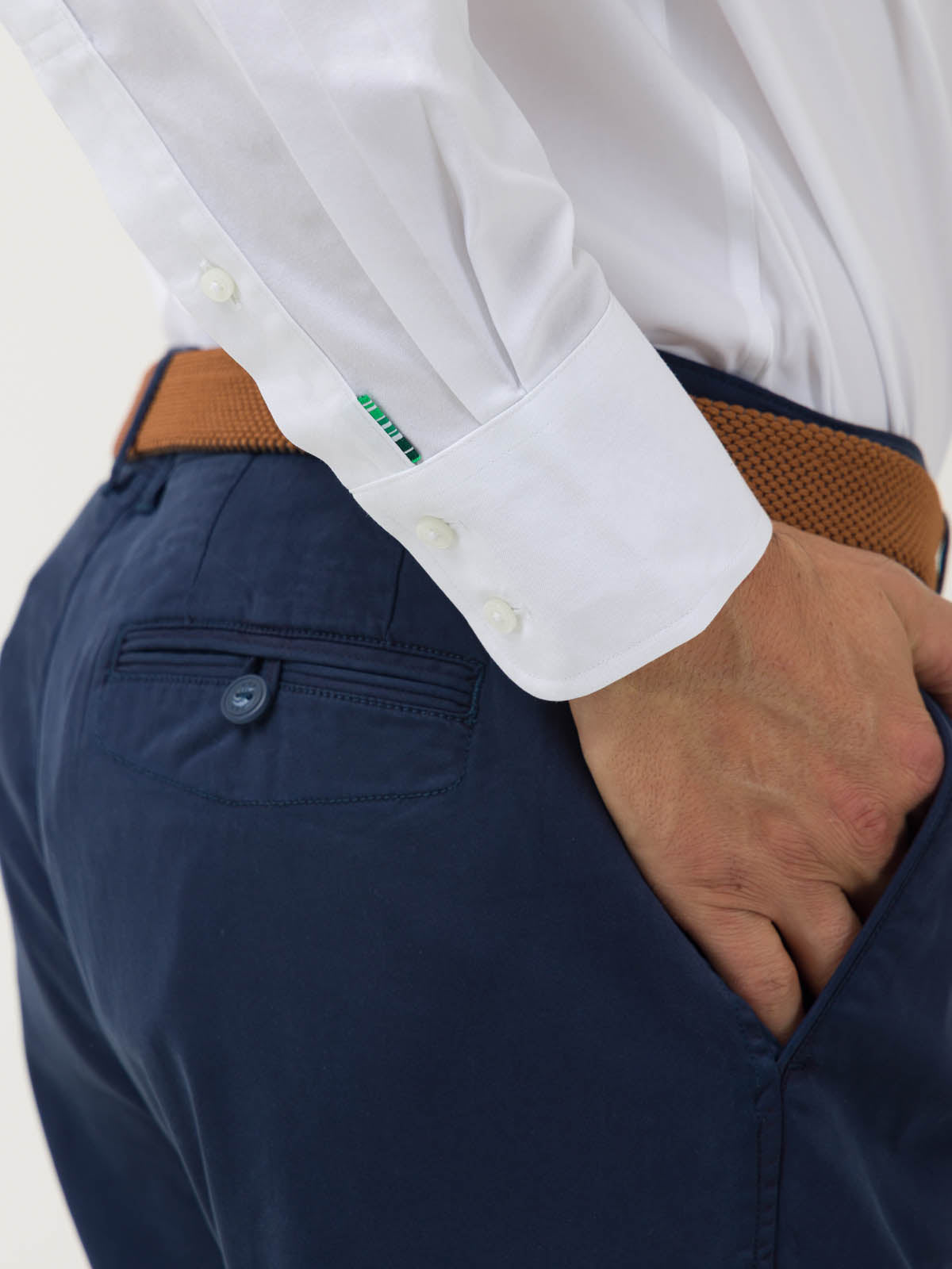 Clásica camisa blanca y celeste RKF con cuello abotonado y bolsillo de pecho con logo bordado ofrece un look tradicional de la más alta calidad. No solo proporciona comodidad, sino que se mantiene impecable durante todo el día gracias a sus procesos y tecnología avanzada. Además de contar con un acabado especial que elimina la necesidad de planchado, presenta la tecnología WOR (Water Oil Repellent), un tratamiento que repele el agua y el aceite, brindando mayor durabilidad a la prenda y evitando manchas difíciles de lavar. Esta camisa combina estilo atemporal con innovación funcional, debido a su tecnología Travel 360° lo que da una mayor facilidad de movimientos.