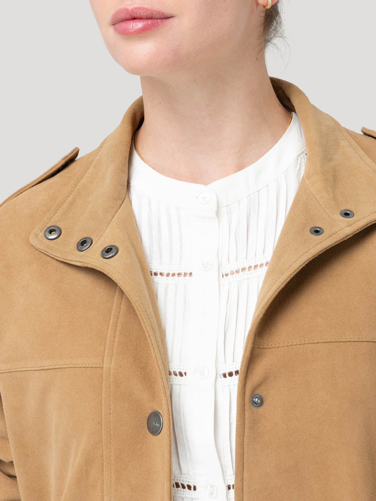 La Chaqueta Rawina está confeccionada al 100% en cuero de alta calidad, lo que le proporciona una textura única y durable. Su diseño de cuello alto aporta un aire elegante y moderno, mientras que la cerradura de botones en el frente ofrece un cierre práctico y estilizado.