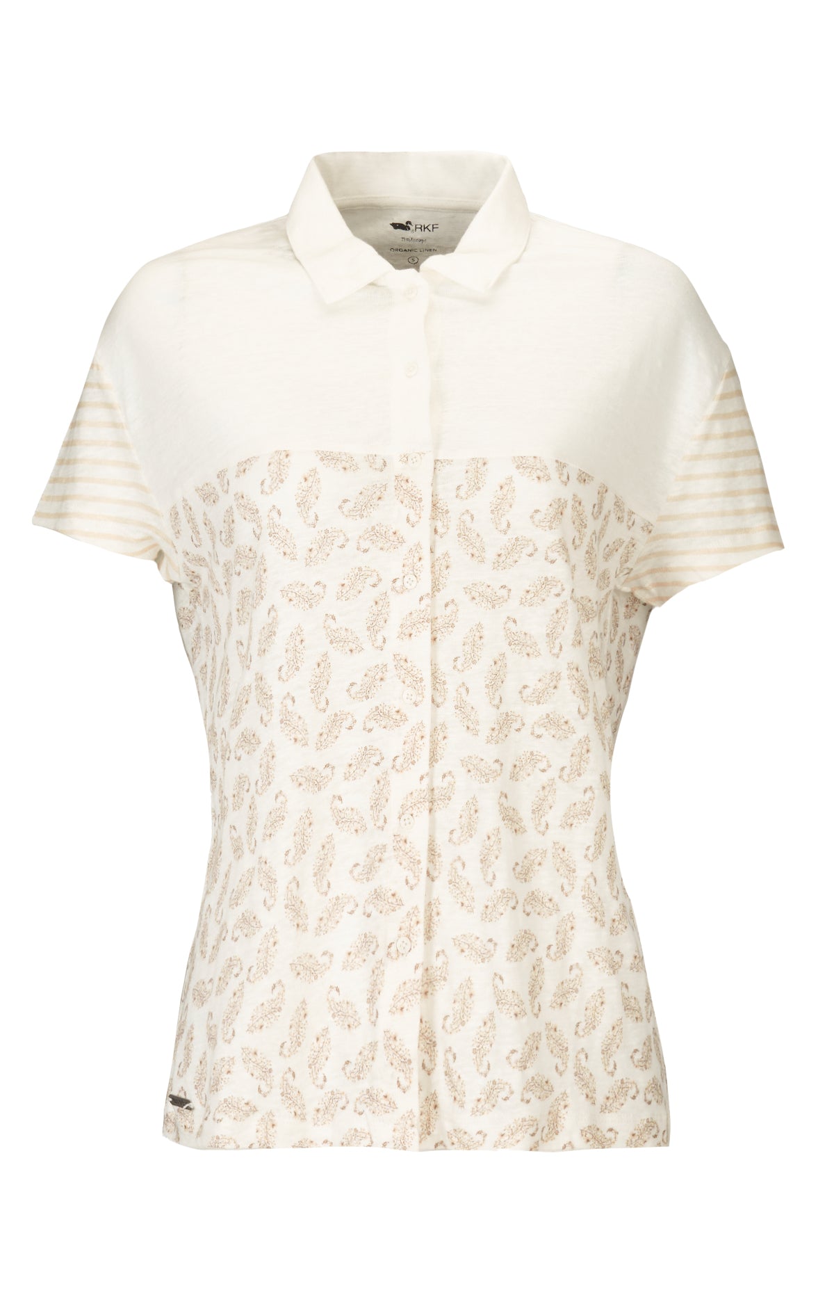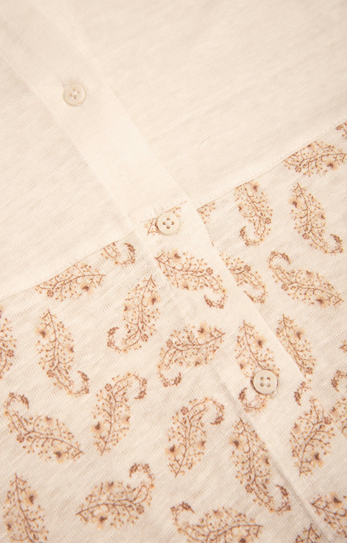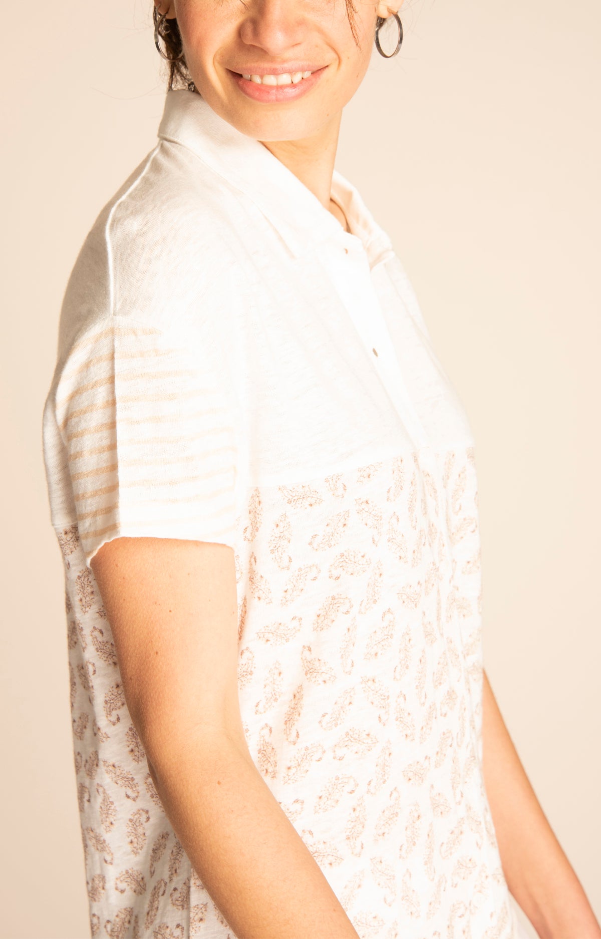 Polera manga corta de lino orgánico, holgada, que inspiran en la comodidad y mayor frescura. Con diferentes estampados, en mangas lineal, en la parte inferior un diseño de paisley. Cuello camisero y botones de madera que dan un toque más rústico y natural.